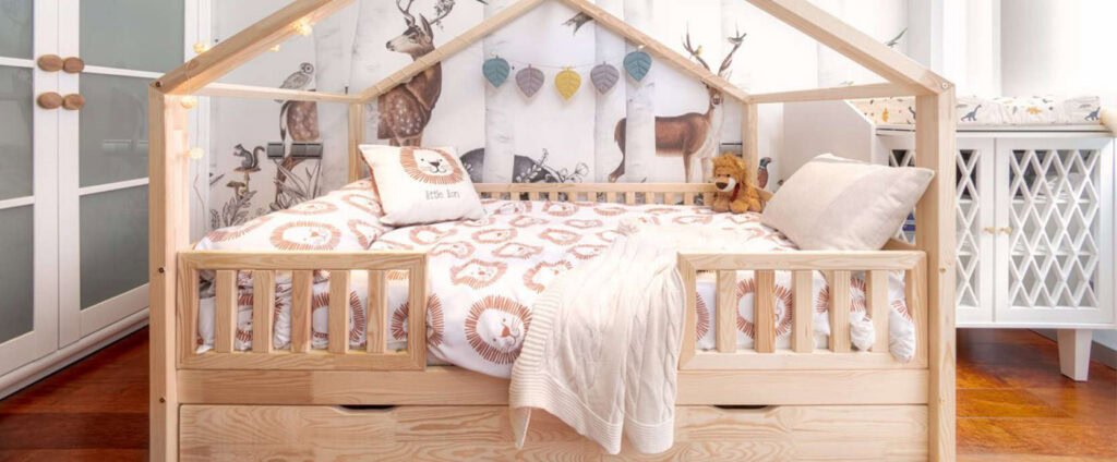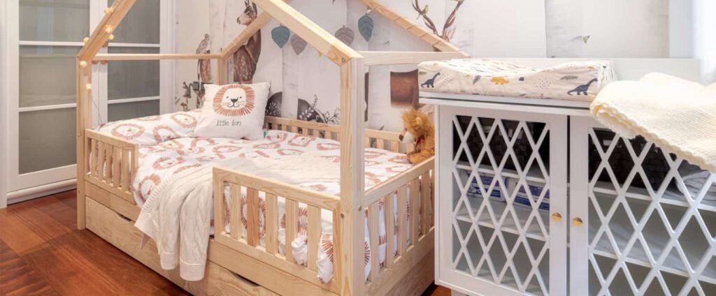 Diseñamos un escenario inspirado en la naturaleza salvaje, donde un mural vibrante, una casita de madera y textiles de leones despiertan la imaginación. Con mobiliario a medida y piezas lúdicas, hemos creado un espacio dinámico que no solo acoge al bebé de hoy, sino que espera preparado al niño explorador de mañana.