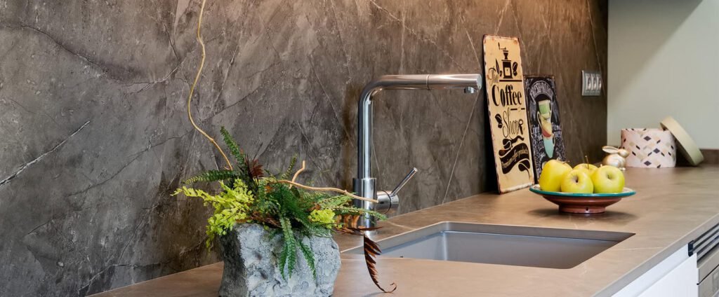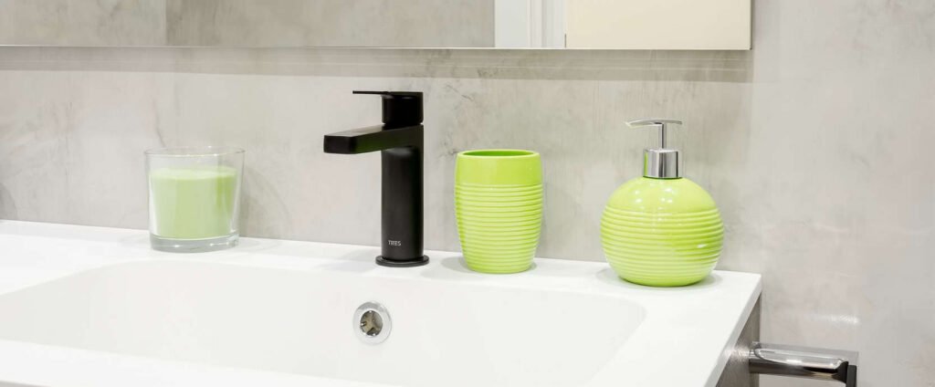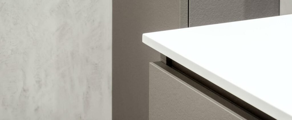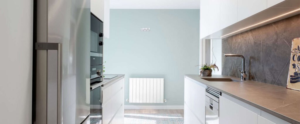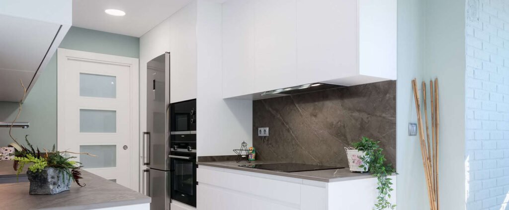 Para vestirla, dejamos que la naturaleza entre en casa. Diseñamos una paleta sensorial donde las texturas tierra de la encimera y el verde agua de las paredes aportan frescura y calma, creando un refugio orgánico sobre un lienzo neutro y atemporal.